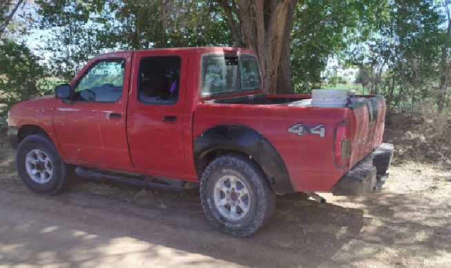 Se trata de una camioneta Nissan Frontier en color rojo, con placas fronterizas, en cuya parte trasera se encontraban los cuerpos, parcialmente cubiertos con cobijas.