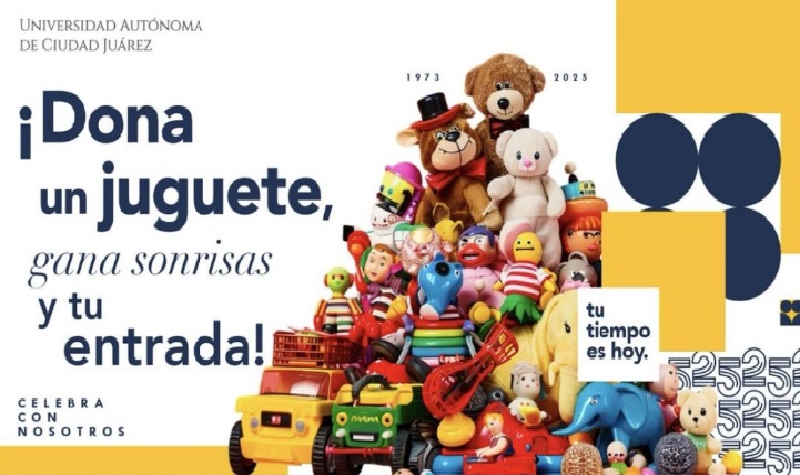 La Universidad Autónoma de Ciudad Juárez (UACJ) informa a la comunidad que, para la recolección de juguetes nuevos, no bélicos y sin pilas, en el marco de la campaña ¡Dona un juguete, gana sonrisas y tu entrada!, este sabado 4 de octubre únicamente abrirá el Centro Cultural de las Fronteras, ubicado en el anillo envolvente José Reyes Estrada, #445, zona Pronaf, en un horario de 10:00 a16:00 horas.