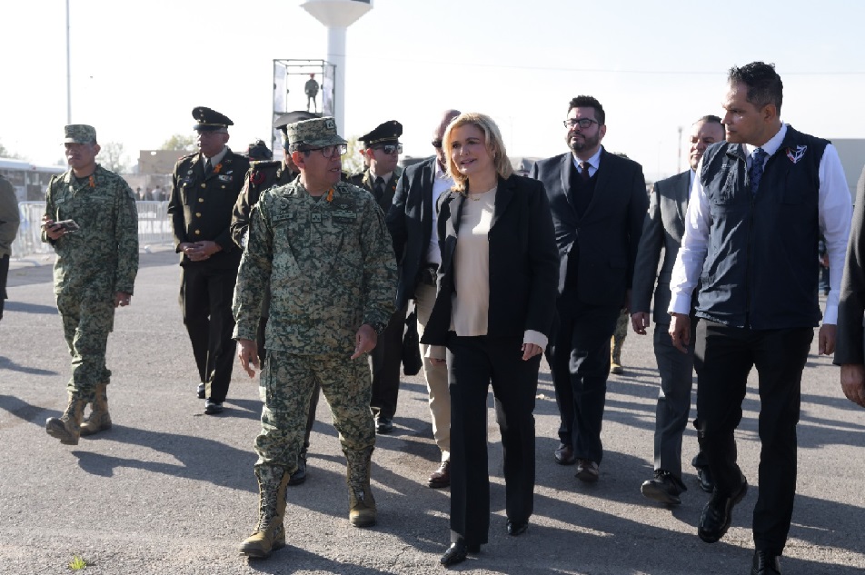 La gobernadora Maru Campos acudió como invitada de honor a la ceremonia de inauguración de la exposición militar “La Gran Fuerza de México”, en la que la Secretaría de la Defensa Nacional (Sedena) muestra a la ciudadanía parte de su equipo y esquema de trabajo.