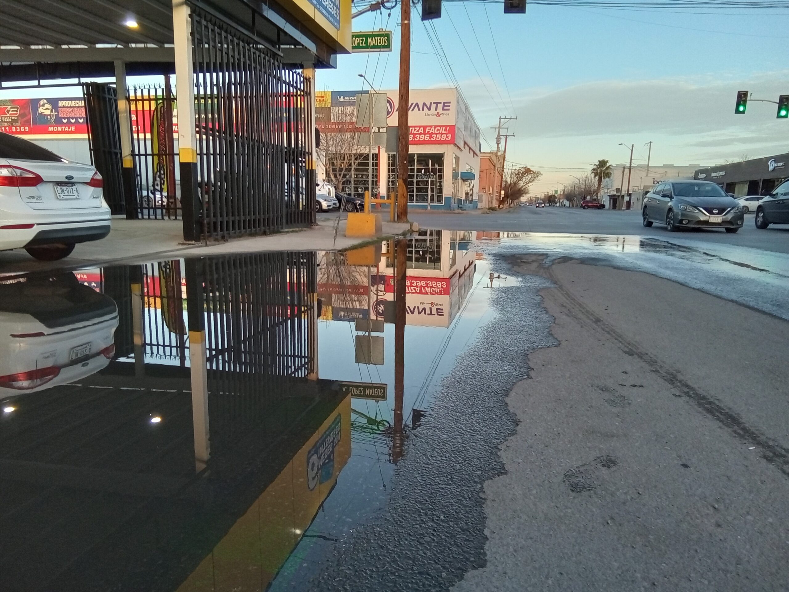 Desde el pasado domingo, vecinos y comerciantes ubicados en el cruce de la avenida López Mateos y avenida Insurgentes han reportado una fuga en la línea principal de distribución de agua potable del sector. Al día de hoy, jueves, se cumplen cinco días de derrame continuo.