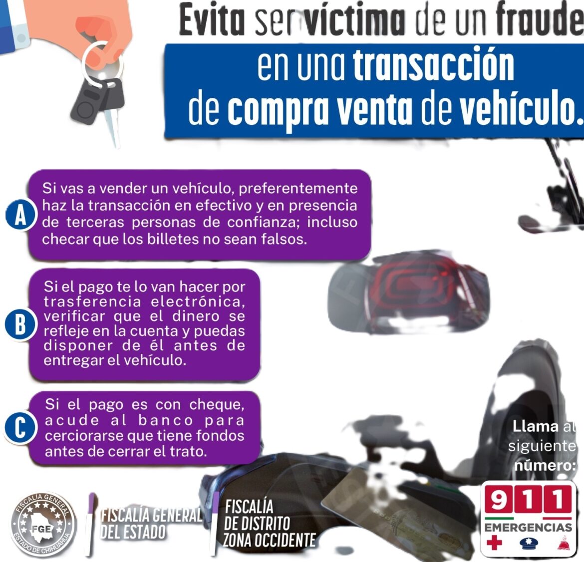 Por lo anterior, la Fiscalía recomienda a las personas que tienen a la venta un vehículo, preferentemente hacer la transacción en efectivo y en presencia de terceras personas de confianza; incluso, checar que los billetes no sean falsos