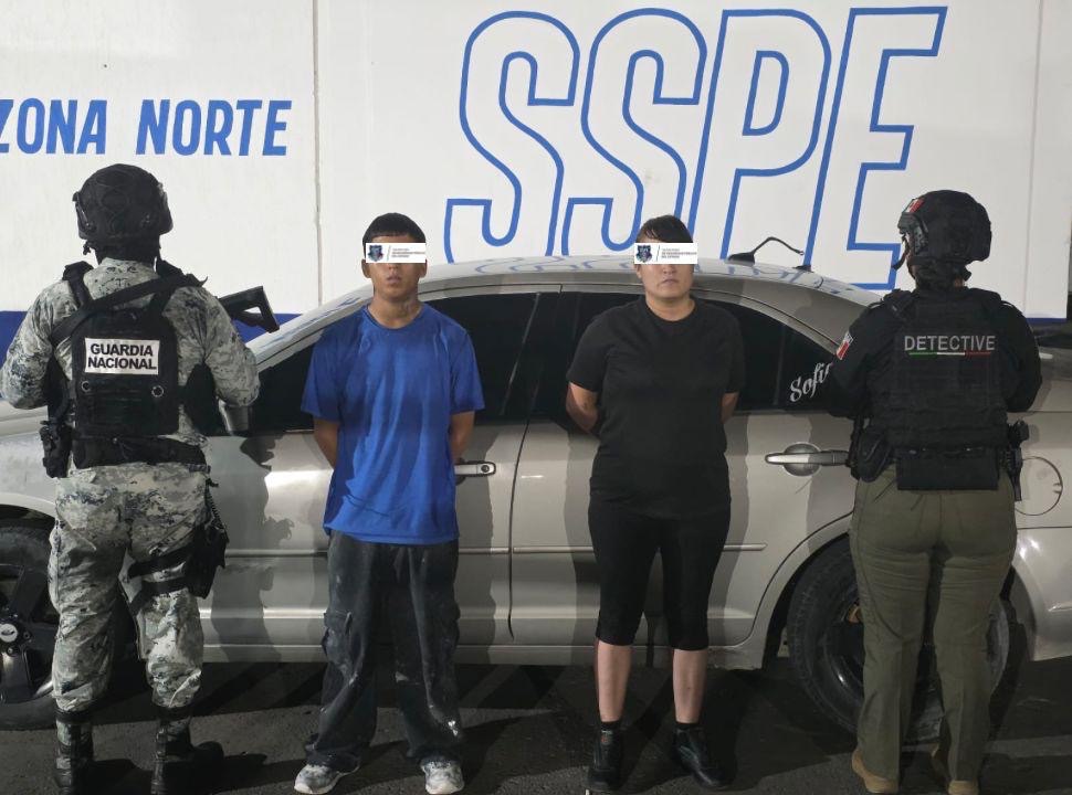 Al realizar una inspección preventiva, se localizaron dos armas de fuego cortas, 19 cartuchos y una bolsa con 245 gramos de sustancia cristalina similar a la metanfetamina, motivo por el cual se procedió a la detención de Claudia Nallely “N”, de 34 años, y Eduardo “N”, de 20 años.