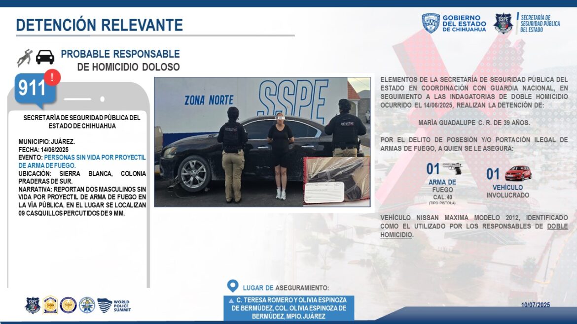 En un operativo coordinado entre la Secretaría de Seguridad Pública del Estado (SSPE) y la Guardia Nacional, se llevó a cabo la detención de una mujer de 39 años en Ciudad Juárez, identificada como María Guadalupe C. R., quien mantenía posesión de un vehículo involucrado en un delito previo de alto impacto y portaba consigo un arma de fuego.