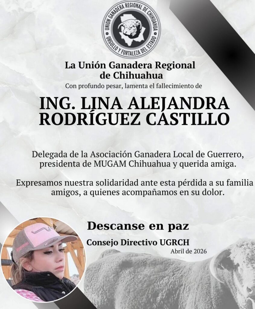 La comunidad agropecuaria de Chihuahua se encuentra consternada por el asesinato de Lina Alejandra Rodríguez Castillo, empresaria y secretaria nacional de la organización Mujeres Ganaderas de México (MUGAM), ocurrido la tarde del miércoles en el municipio de Cuauhtémoc.