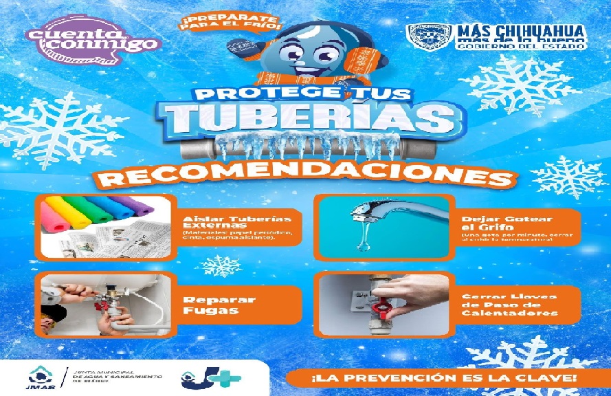 Con la entrada del frente frío número 27 al estado de Chihuahua, se pronostica un marcado descenso en las temperaturas para el próximo fin de semana, ante esta situación, la Junta de Agua y Saneamiento de Juárez, exhorta a la ciudadanía, a tomar precauciones en hogares y comercios, para de evitar fugas de agua ocasionadas por la ruptura de tuberías.