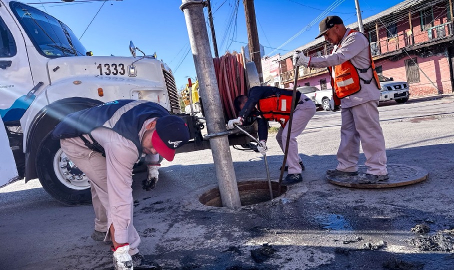 En atención a reportes por brotes de aguas negras en las colonias Barrio Alto y Bellavista, la Junta de Agua y Saneamiento de Juárez, realiza trabajos de mantenimiento en la red sanitaria en calles de la Zona Centro.