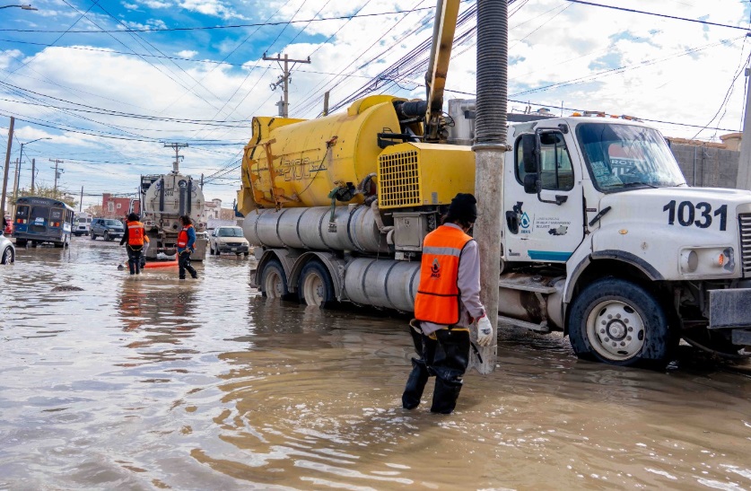La Junta de Agua y Saneamiento de Juárez, sigue trabajando en el desazolve del fraccionamiento Villa Residencial del Real, utilizando equipos especiales de inyección y succión tipo vactor y motobombas.