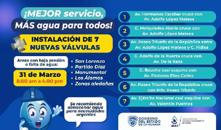 Este martes 31 de marzo, la Junta de Agua y Saneamiento de Juárez, a través del departamento de Eficiencia física, instalará 7 válvulas de seccionamiento, como parte del programa de sectorización.