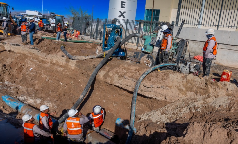 La Junta de Agua y Saneamiento de Juárez (J+) continúa con los trabajos de reparación en una línea de conducción de agua potable de 30 pulgadas sobre el bulevar Talamás Camandari.