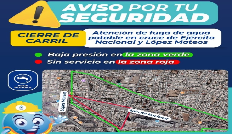 Para llevar a cabo estas labores, será necesario cerrar dos carriles en el cruce de las avenidas Ejército Nacional y López Mateos, a partir de las 6:00 de la mañana. Se solicita la comprensión de los automovilistas que circulan por la zona, así como utilizar vías alternas para evitar contratiempos.