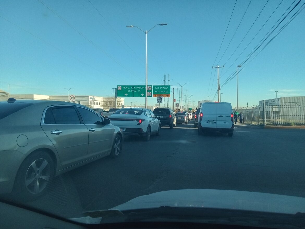 Ciudad Juárez.– Este lunes 2 de marzo, el tráfico volvió a colapsar en varias de las principales avenidas de la ciudad, generando retrasos y molestias para miles de automovilistas que se dirigían a sus centros de trabajo y escuelas.