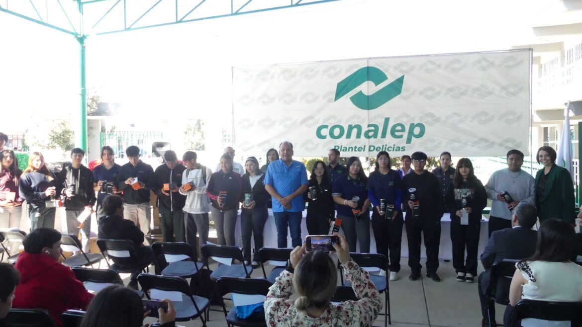 El Director General Estatal de CONALEP Chihuahua, Dr. Omar Bazán Flores, realizó la entrega de termos personalizados a las y los estudiantes del Plantel Delicias, como parte de una iniciativa que busca fomentar la identidad y el sentido de pertenencia entre la comunidad estudiantil.