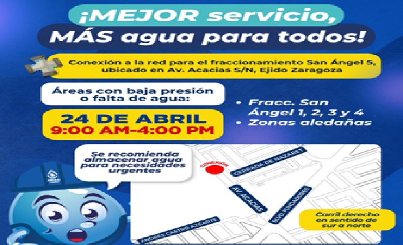 Además, por estas acciones, se registrará baja presión o falta del servicio en los fraccionamientos San Ángel 1, 2, 3 ,4 y zonas aledañas.