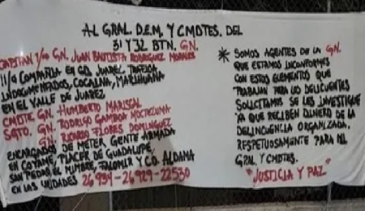 El texto incluía una lista de nombres de comandantes y agentes, a quienes se les atribuyen presuntos vínculos con grupos delictivos y el uso de vehículos oficiales para trasladar personas armadas hacia el corredor Aldama–Ojinaga.
