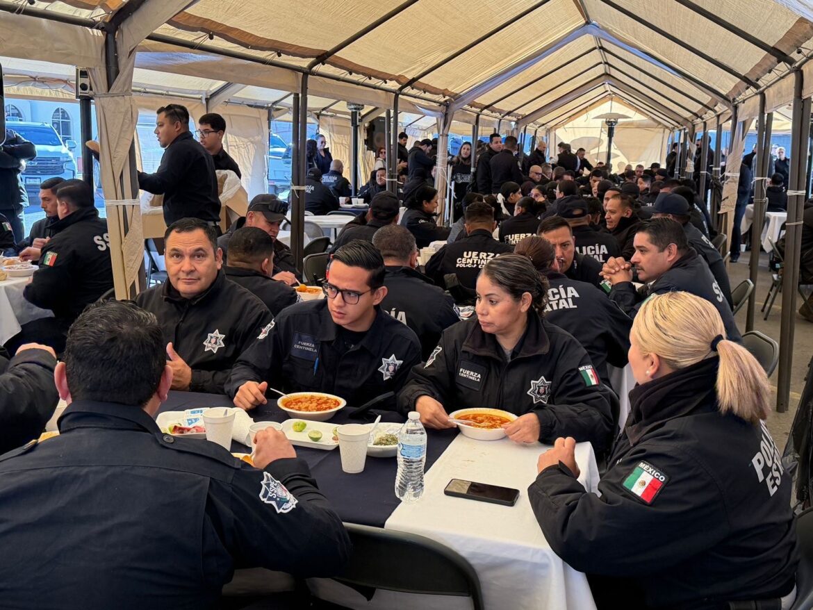 El evento se realizó en las instalaciones de la SSPE en Ciudad Juárez, donde desde las ocho de la mañana de este 2 de enero, subsecretarios y directivos de la institución participaron en la entrega de cientos de platos de menudo a las y los policías que se dieron cita en el lugar, en un ambiente de compañerismo y gratitud.