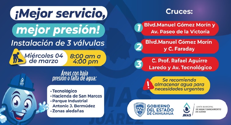 La Junta de Agua y Saneamiento, suspenderá el servicio de agua potable el miércoles 4 de marzo en dos zonas de la ciudad, debido a trabajos de conexión de crucero y la instalación de válvulas como parte de las acciones de mejora y sectorización de la red.