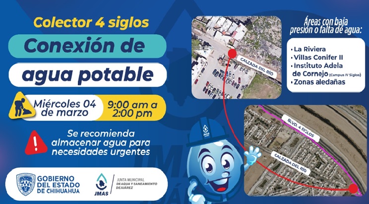 La primera intervención, será la conexión de un crucero de agua potable con tubería de 4 pulgadas, en el cruce de la calle Calzada del Río y bulevar Cuatro Siglos, trabajos que se realizarán de 9 de la mañana a 2 de la tarde.