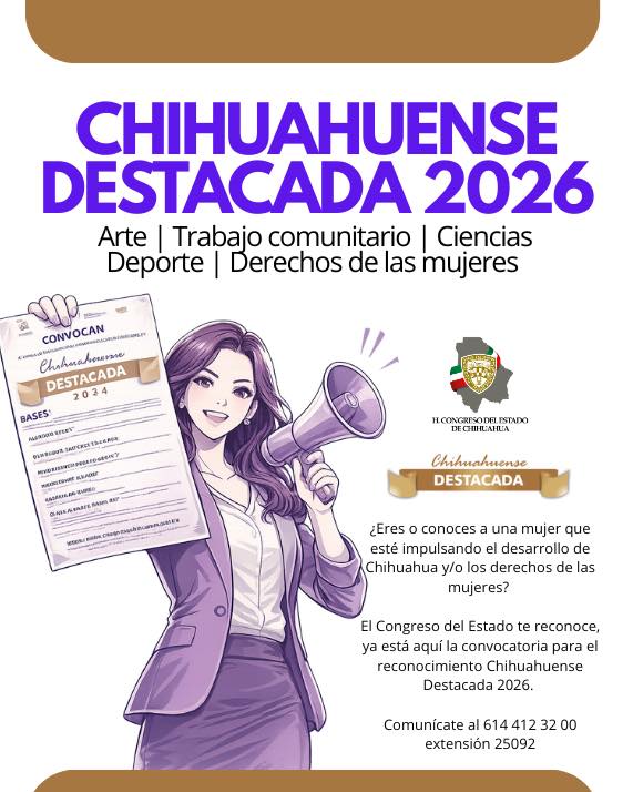 La Sexagésima Octava Legislatura del Congreso del Estado de Chihuahua, a través de la Comisión de Igualdad, y el Gobierno del Estado, mediante el Instituto Chihuahuense de las Mujeres, convocan a todas las mujeres del estado a participar en el reconocimiento “Chihuahuense Destacada 2026”.
