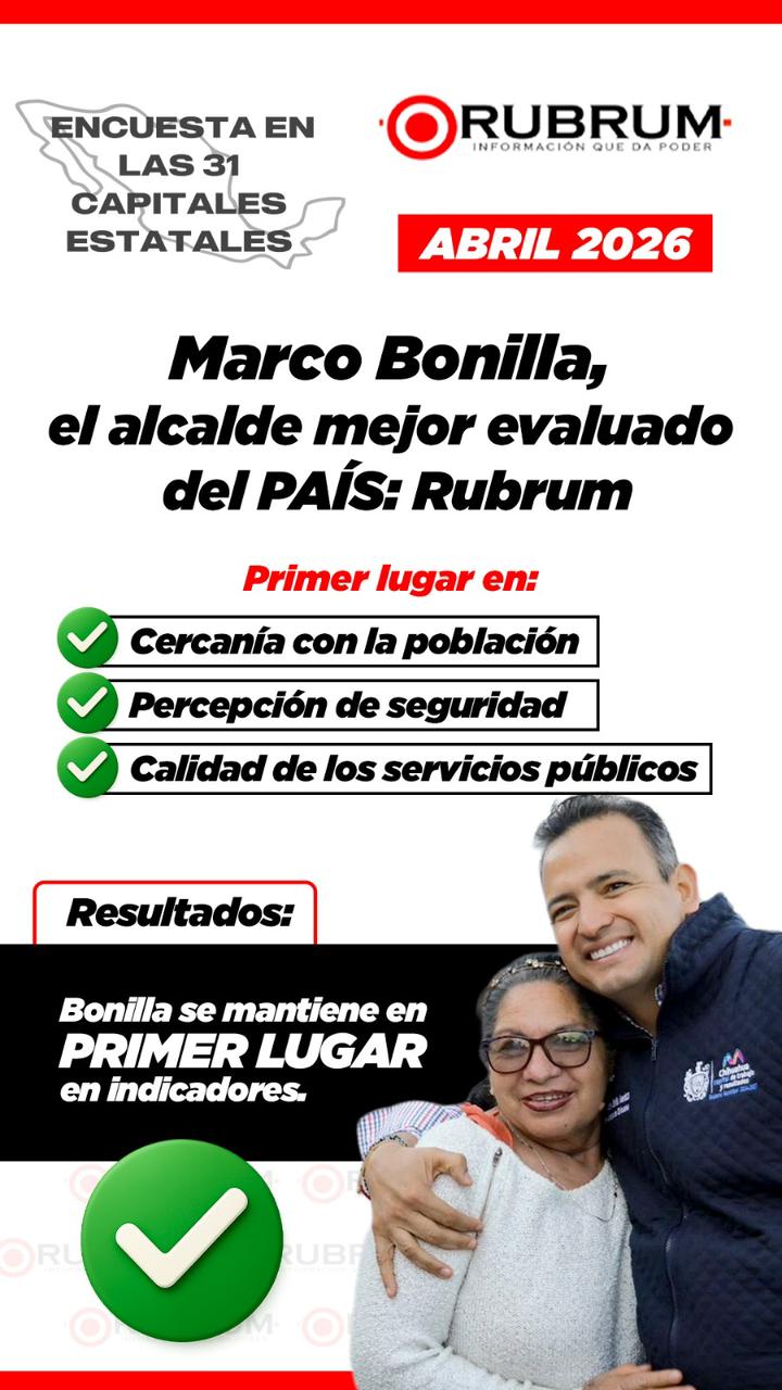 H. Ciudad de Chihuahua, Chihuahua.- El alcalde Marco Bonilla encabeza resultados nacionales al posicionar a Chihuahua Capital en el primer lugar del ranking de capitales estatales en percepción de seguridad, servicios públicos y desempeño de gobierno, de acuerdo con la más reciente encuesta de la casa consultora RUBRUM correspondiente a abril de 2026.