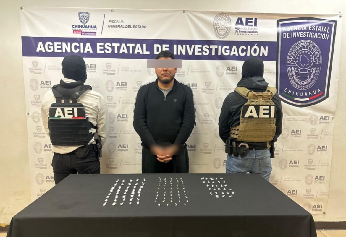 Elementos de la Agencia Estatal de Investigación adscritos a la Fiscalía de Distrito Zona Norte, detuvieron en flagrancia a Lorenzo Antonio G. M., por encontrarse en posesión de 122 envoltorios de dosis de cocaína y cocaína en piedra, cuando tripulaba un vehículo por la colonia Aldama, en Ciudad Juárez.