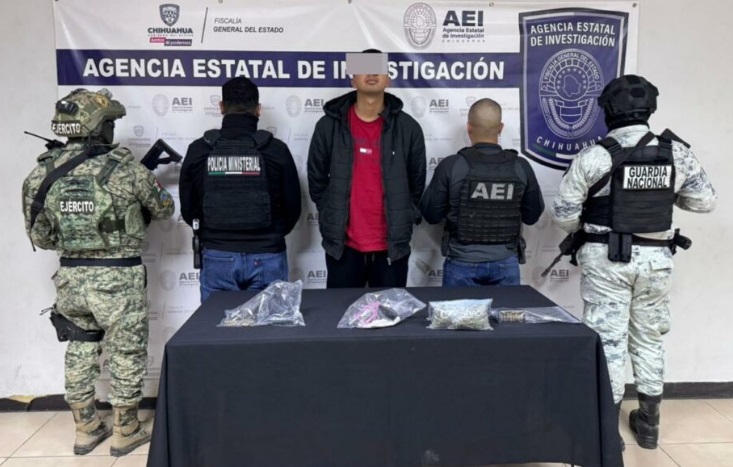 Elementos de la Agencia Estatal de Investigación adscritos al Centro de Operaciones Estratégicas de la Fiscalía de Distrito Zona Norte, detuvieron al masculino identificado como Johan Isac M. F., por delitos contra la salud y posesión ilegal de armas de fuego, en Ciudad Juárez.