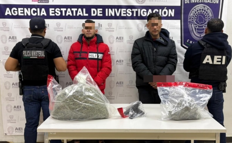 Elementos de la Agencia Estatal de Investigación de Distrito Zona Norte, detuvieron a dos personas de nombres, Francisco Javier G. M. y Alfredo Alejandro O. S., por posesión ilegal de arma de fuego y delitos contra la salud, en la colonia Los Alcaldes, en Ciudad Juárez.