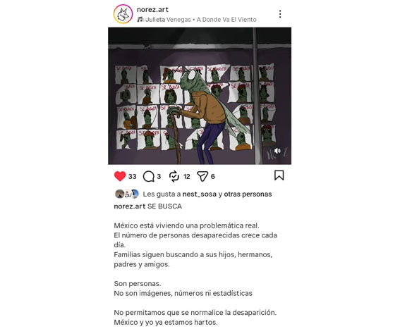 Finalmente, el artista manifestó su deseo de continuar creando piezas que aborden problemáticas político-sociales que afectan al país. Actualmente, la ilustración cuenta con mil 83 vistas en su cuenta de Instagram, identificada como norez.art.