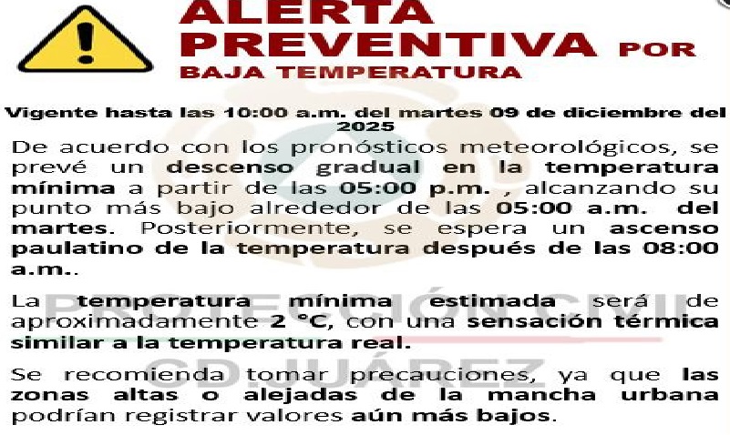 La Dirección de Protección Civil del Municipio emitió una alerta preventiva por baja temperatura, la cual permanecerá vigente hasta las 10:00 de la mañana del martes 9 de diciembre, debido al marcado descenso térmico pronosticado para esta noche y madrugada.