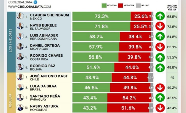 Claudia Sheinbaum Pardo, encabeza el ranking de los presidentes de Latinoamérica presentado por la CB Global Data, siendo la presidenta mejor valorada por sus ciudadanos en la lista de marzo de 2026.