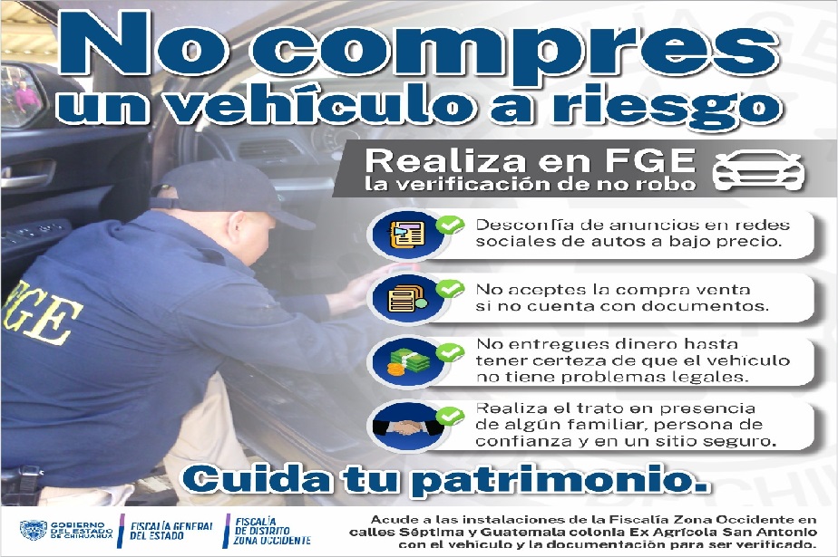 La Fiscalía de Distrito Zona Occidente hace un llamado a las personas que en esta temporada buscan adquirir un vehículo, a que se cercioren de que su procedencia es lícita, ya que evitará que pongan en riesgo su patrimonio y enfrentar problemas legales.