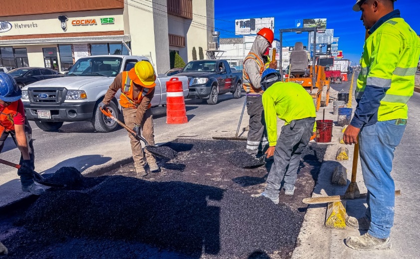 Equipo especializado de la Junta de Agua y Saneamiento de Juárez (J+) concluye los trabajos de bacheo en el cruce de la avenida Tecnológico y calle Aguirre Laredo, tras atender el pasado domingo por la tarde un hundimiento presentado a consecuencia de una ruptura en la tubería de drenaje.