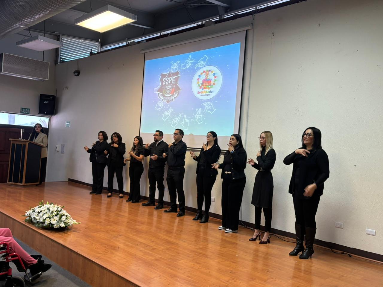 Estudiantes de la Maestría en Derechos Humanos y Perspectiva de Género de la Secretaría de Seguridad Pública del Estado (SSPE), presentaron su proyecto final con la interpretación de una canción en Lengua de Señas Mexicana (LSM), asignatura cursada con el objetivo de fortalecer en los funcionarios públicos una perspectiva de inclusión, igualdad y respeto.