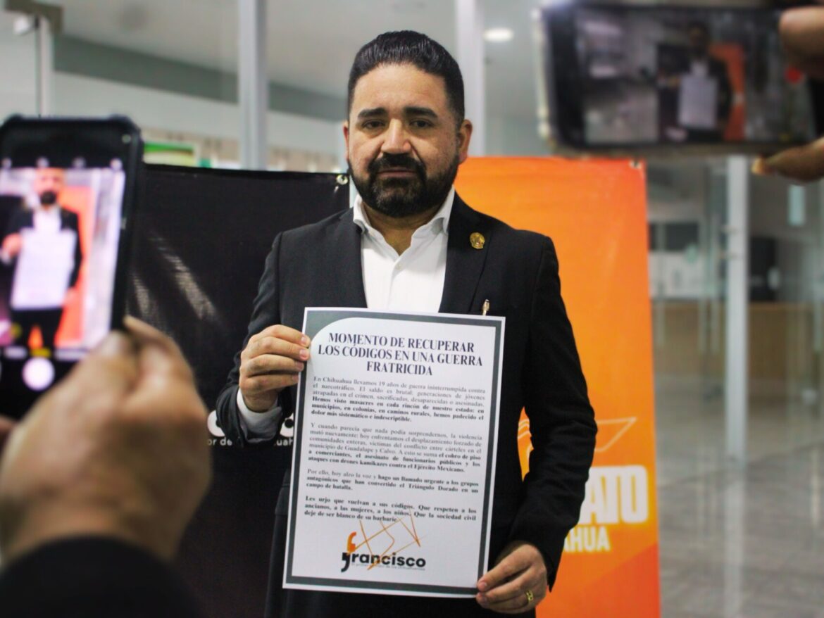 En Chihuahua llevamos 19 años de guerra ininterrumpida contra el narcotráfico. El saldo es brutal: generaciones de jóvenes atrapadas en el crimen, sacrificadas, asesinadas. Así lo declaró el diputado y coordinador de la Bancada Naranja de Movimiento Ciudadano, Francisco Sánchez Villegas, al presentar una carta abierta a los grupos del crimen organizado para que recuperen los códigos y cese el derramamiento de sangre inocente en Chihuahua.