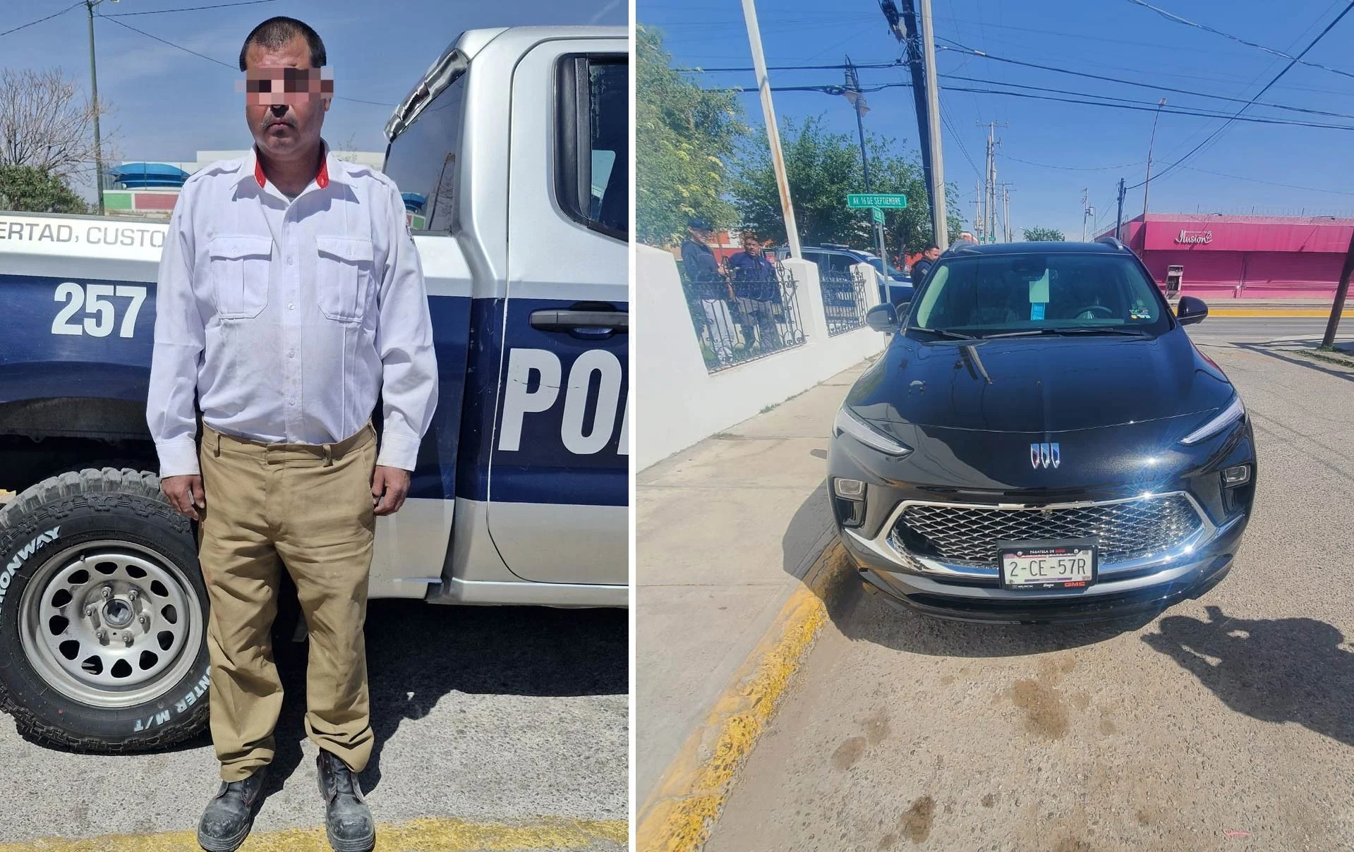 El funcionario detalló que el presunto responsable se apoderó de un automóvil Buick Encore de color negro, con placas del estado de Chihuahua, el cual sustrajo del establecimiento ubicado en el cruce de Paseo Triunfo de la República y Francisco Márquez, luego de causar daños en los cristales del inmueble.
