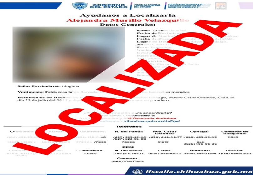 Los familiares de la menor de 15 años de edad localizada, la reportaron como desaparecida el 29 de julio del 2025, luego de que fue vista por última vez en la Sección Hidalgo en el municipio de Nuevo Casas Grandes el 22 de julio del 2025.