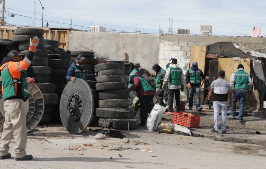 A través de diversas dependencias municipales, hoy se atendieron varias denuncias ciudadanas y llevó a cabo el retiro de un asentamiento irregular que operaba como llantera, compra de metales y taller mecánico en un predio no autorizado.