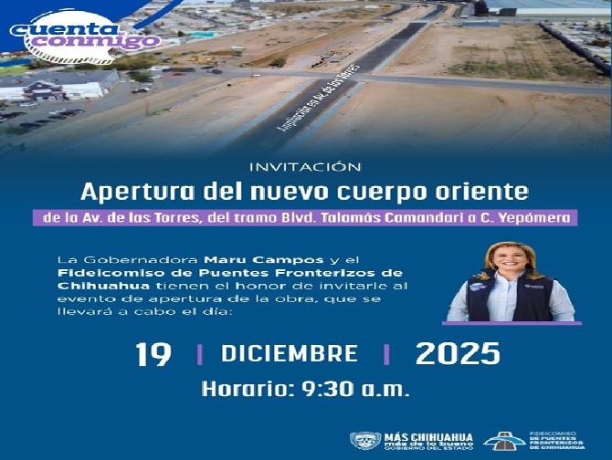 Se espera que al acto protocolario asita la Gobernadora del Estado Maru Campos, así como autoridades del Fideicomiso de Puentes Fronterizos y Municipales.