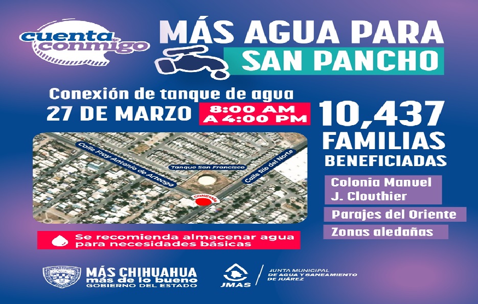 Este viernes 26 de marzo, la Junta de Agua y Saneamiento de Juárez, realizará trabajos de interconexión de una línea de conducción, proveniente de los pozos 207 y 209 hacia el tanque San Francisco, acción preventiva ante la llegada de temporada de calor para que la zona de San Pancho pueda tener más agua y mejor presión.