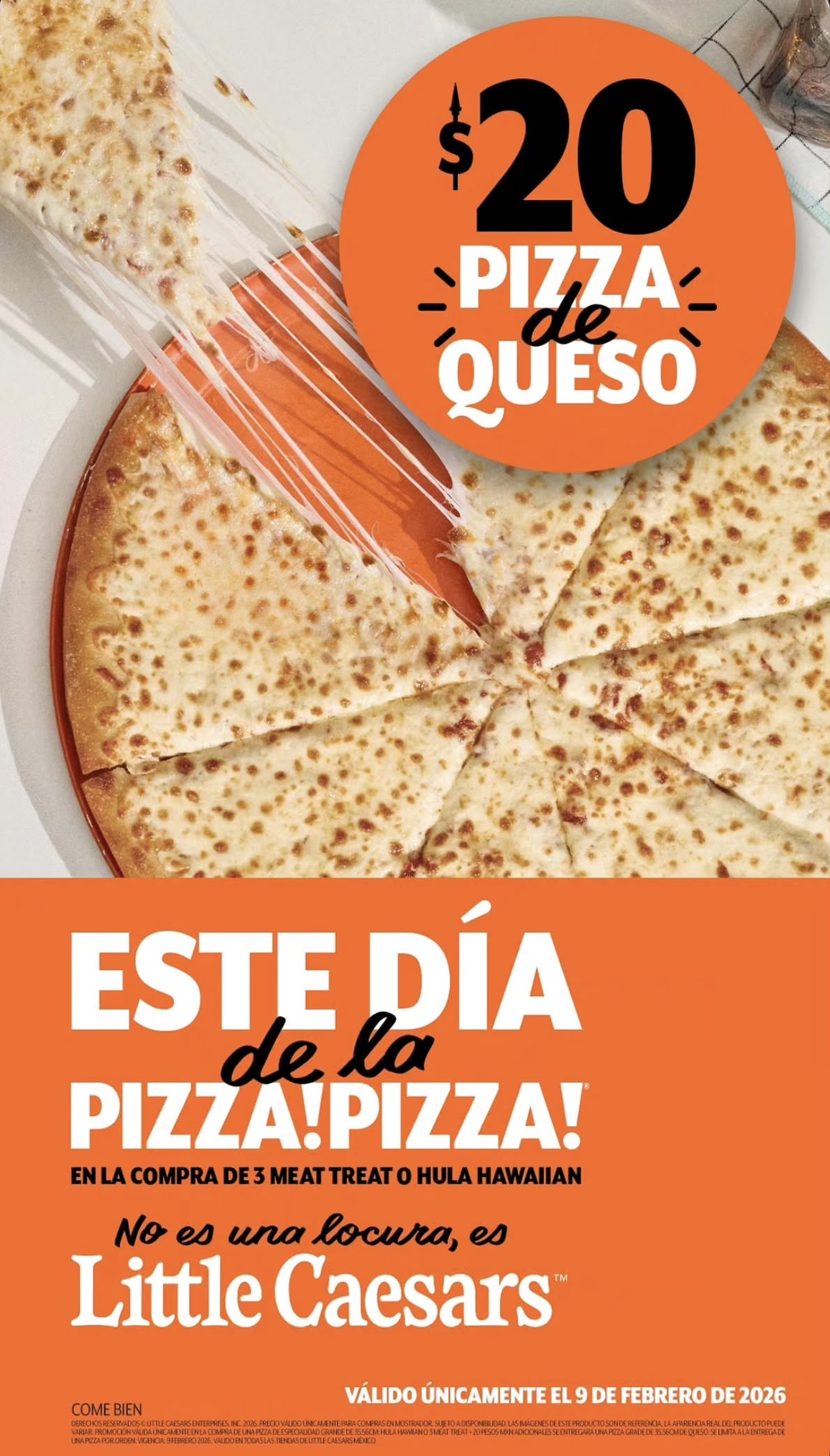 De acuerdo con la información difundida, la promoción permitirá a los clientes adquirir una pizza grande de queso por solo 20 pesos, aunque para acceder a este precio es necesario cumplir con una condición previa. Los consumidores deberán comprar primero una pizza de especialidad, entre las que se incluyen opciones como Tres Carnes o Hawaiana.