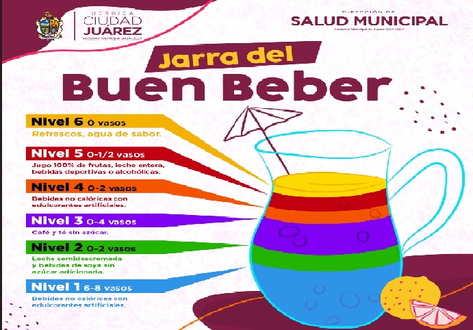 Para orientar a la población, la Secretaría de Salud elaboró el material informativo denominado “La Jarra del Buen Beber”, similar al “Plato del Bien Comer”, el cual clasifica las bebidas en seis niveles de acuerdo con la cantidad recomendada para su consumo diario.