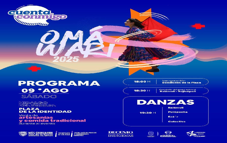 La Secretaría de Cultura, en colaboración con la Secretaría de Pueblos y Comunidades Indígenas, el Ayuntamiento de Hidalgo del Parral y la Asociación Civil Chihuahua Apache, invitan al Festival Omáwari, un punto de encuentro para la diversidad de los pueblos originarios.