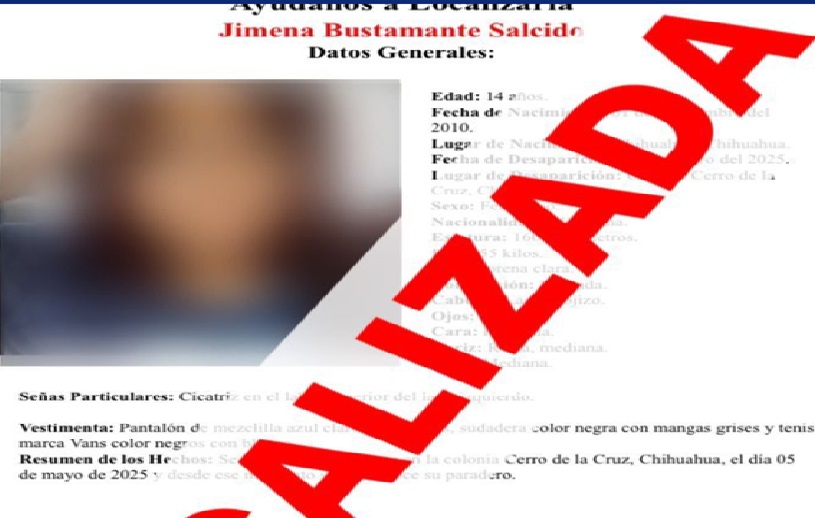 El reporte de ausencia y/o extravío establece que la menor de 14 años de edad, era buscada desde el pasado lunes 05 de mayo, cuando había sido vista por última vez en la colonia Cerro de la Cruz, en la ciudad de Chihuahua.