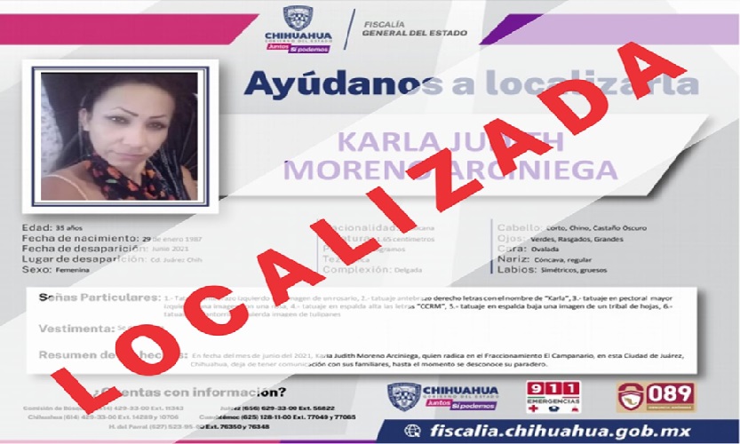 La Fiscalía Especializada en Atención a Mujeres Víctimas del Delito por Razones de Género y a la Familia (FEM), localizó sana y salva a una mujer de iniciales K. J. M. A., quien contaba con reporte de ausencia interpuesto en junio del año 2021, en Ciudad Juárez