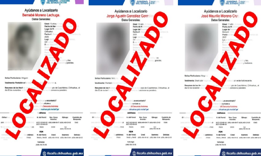 Los tres menores localizados son: Bernabé M. L., de 11 años de edad; José Maurilio M. C., de 13 años y Jorge A. G. G., de 13 años de edad, a quienes encontraron a la altura del kilómetro 12 del periférico Gómez Morín, en la ciudad de Cuauhtémoc.