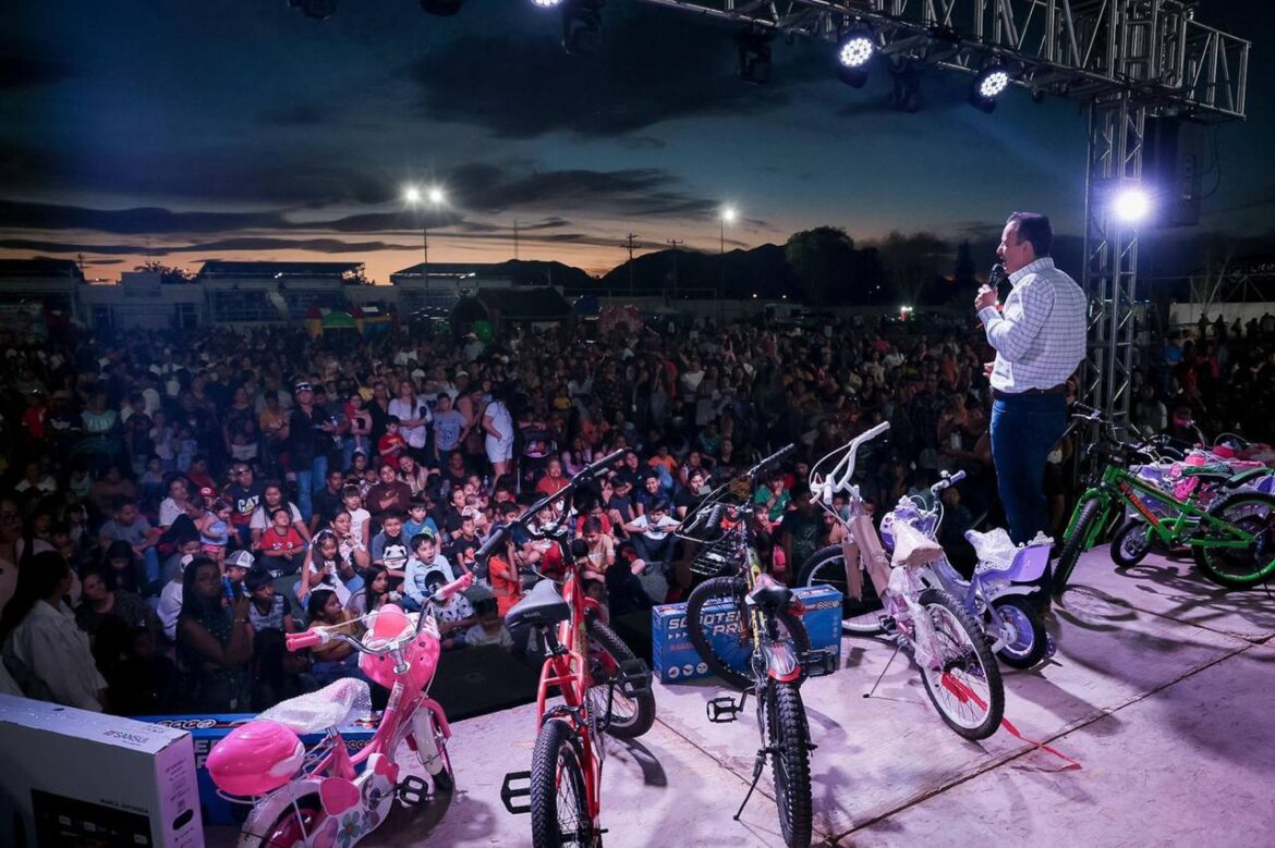 Camargo, Chih.— Como parte de su gira de trabajo por los municipios de Aldama, Saucillo y Camargo, el alcalde de Chihuahua, Marco Bonilla, atendió la invitación del alcalde Jorge Aldana para participar en el Mega Festival de la Niñez, un evento que reunió a más de 2 mil 500 camarguenses en el campo de futbol de la colonia Revolución.