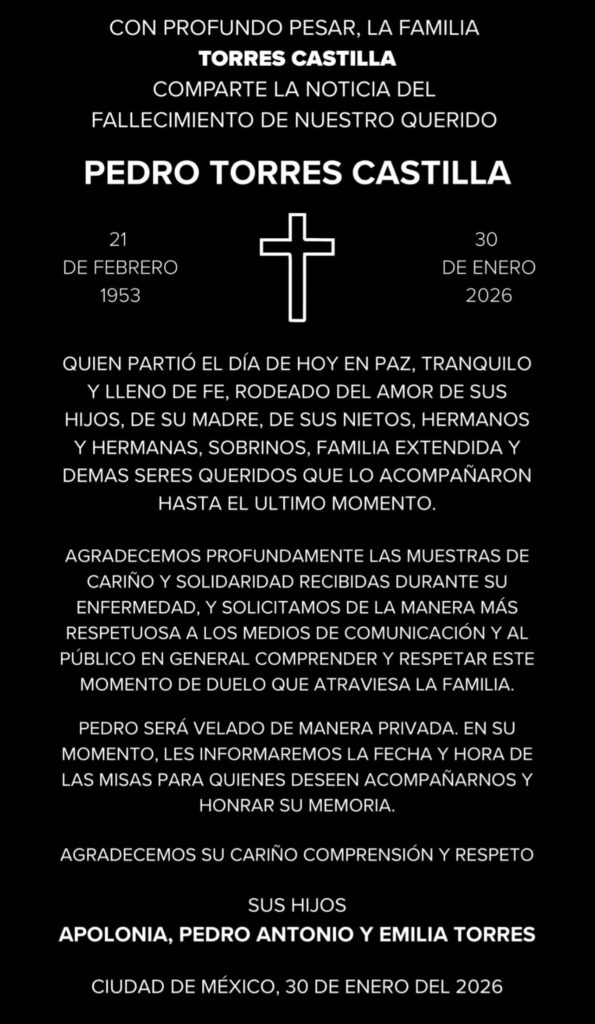 La noticia de su muerte fue confirmada a través de la cuenta oficial de Instagram del productor, donde sus hijos compartieron que Pedro Torres “partió en paz, tranquilo y lleno de fe, rodeado del amor de su familia y seres queridos”.