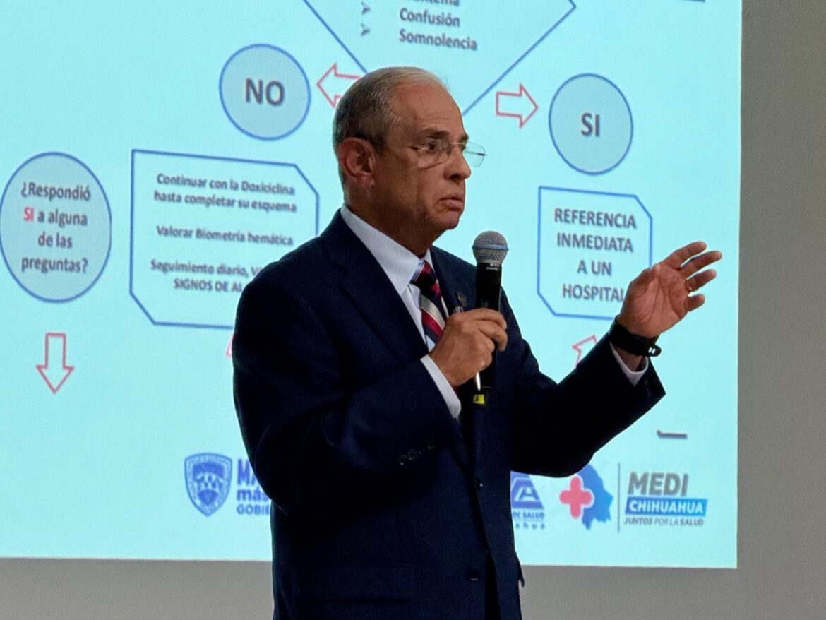 El director del Distrito de Salud II Juárez, Rogelio Covarrubias, realizó una ponencia titulada “Panorama Epidemiológico de la Rickettsia”, donde abordó los casos presentados y edades afectadas en Ciudad Juárez.