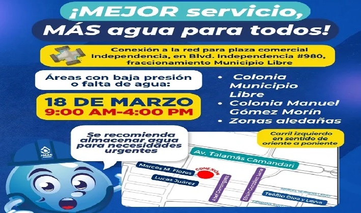 En consecuencia, se impactará la prestación del servicio en las colonias: Municipio Libre, Manuel Gómez Morín y zonas aledañas.