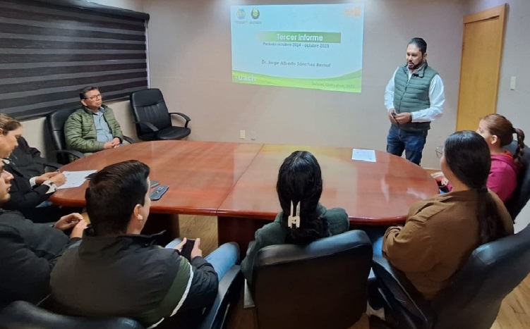 En cumplimiento de las atribuciones establecidas en el Artículo 38, fracción IX de la Ley Orgánica de la Universidad Autónoma de Chihuahua, el director de la Facultad de Ciencias Agrícolas y Forestales, el Dr. Jorge Alberto Sánchez Bernal, presentó su Tercer Informe de Actividades, en el que dio a conocer avances, acciones y resultados alcanzados durante el periodo.
