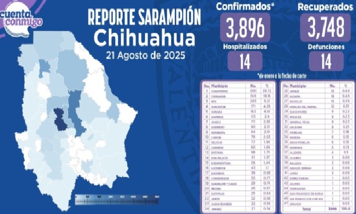 A este ritmo, a mitad de la próxima semana (27 o 28 de agosto), se estaría cruzando la cifra de 4 mil chihuahuenses contagiados de sarampión.